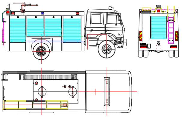 上裝結構及性能參數總體布置 | 整車(chē)由消防員乘員室和車(chē)身兩大部分組成,車(chē)身布置采用內藏罐式結構,左右兩側為器材箱,中部為水罐,器材箱后部為泵房。 |