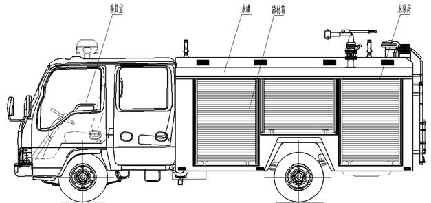 整車(chē)由消防員乘員室和車(chē)身兩大部分組成,車(chē)身布置采用整體框架式結構,內藏水罐,兩邊為器材箱,后部為水泵房,罐體為平行長(cháng)方體廂式容罐。